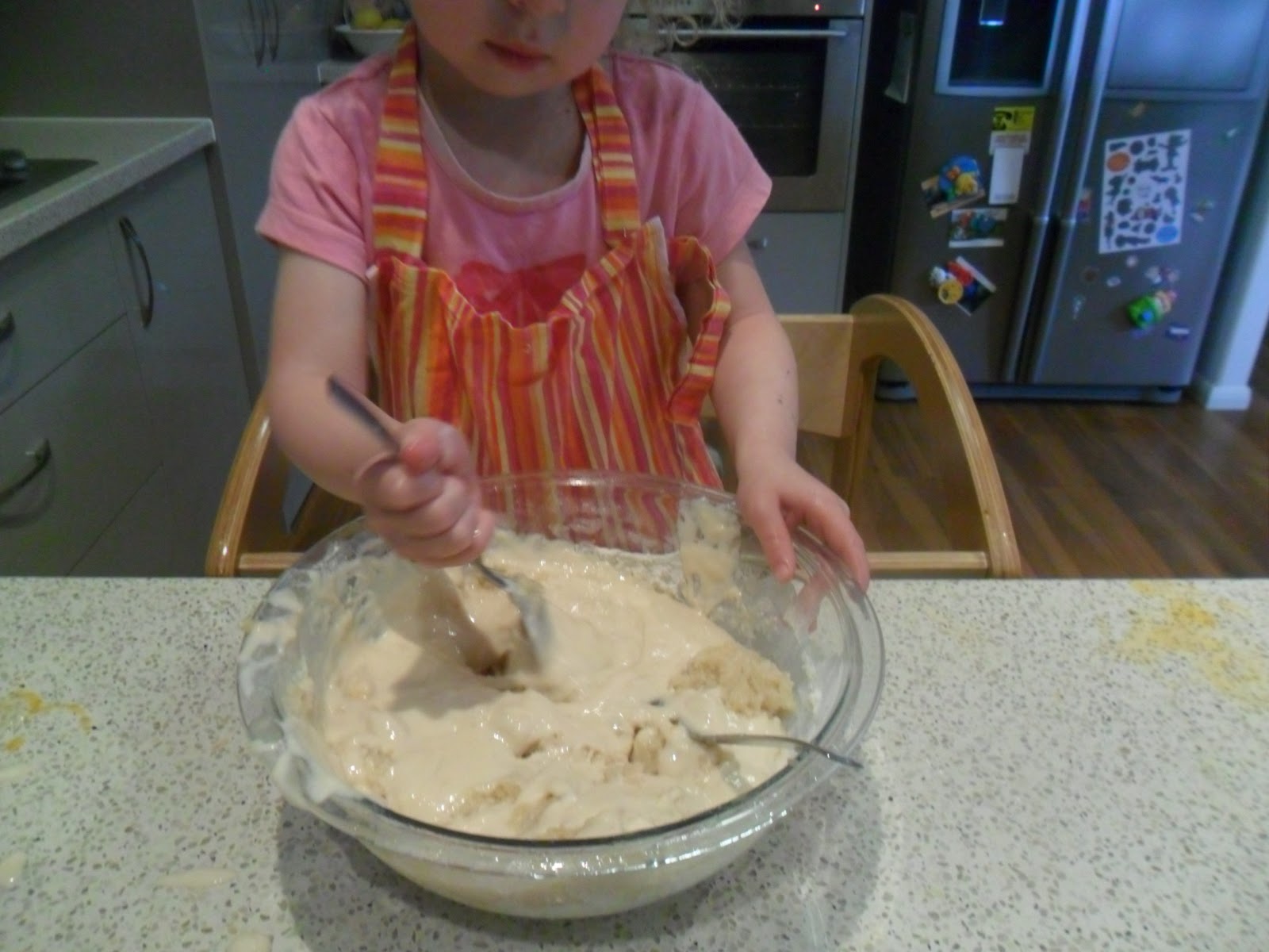 | Bee mixing the yoghurt and eggs. Bear got impatient and added the oil to her flour mix. |